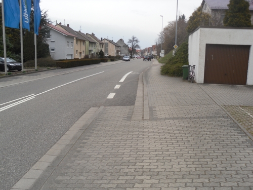 Wie es etwas besser gehen könnte, zeigt das Bild aus Untergrombach. Hier sind die ersten Meter auf der Straße als Fahrradschutzstreifen aufgemalt. Der Radfahrer erhält also eine Rechtfertigung, auf die Straße zu wechseln. Mit der ausgeformten Rampe geht das natürlich besonders gut, aber auch eine nur aufgemalte Lösung wäre besser als nichts.