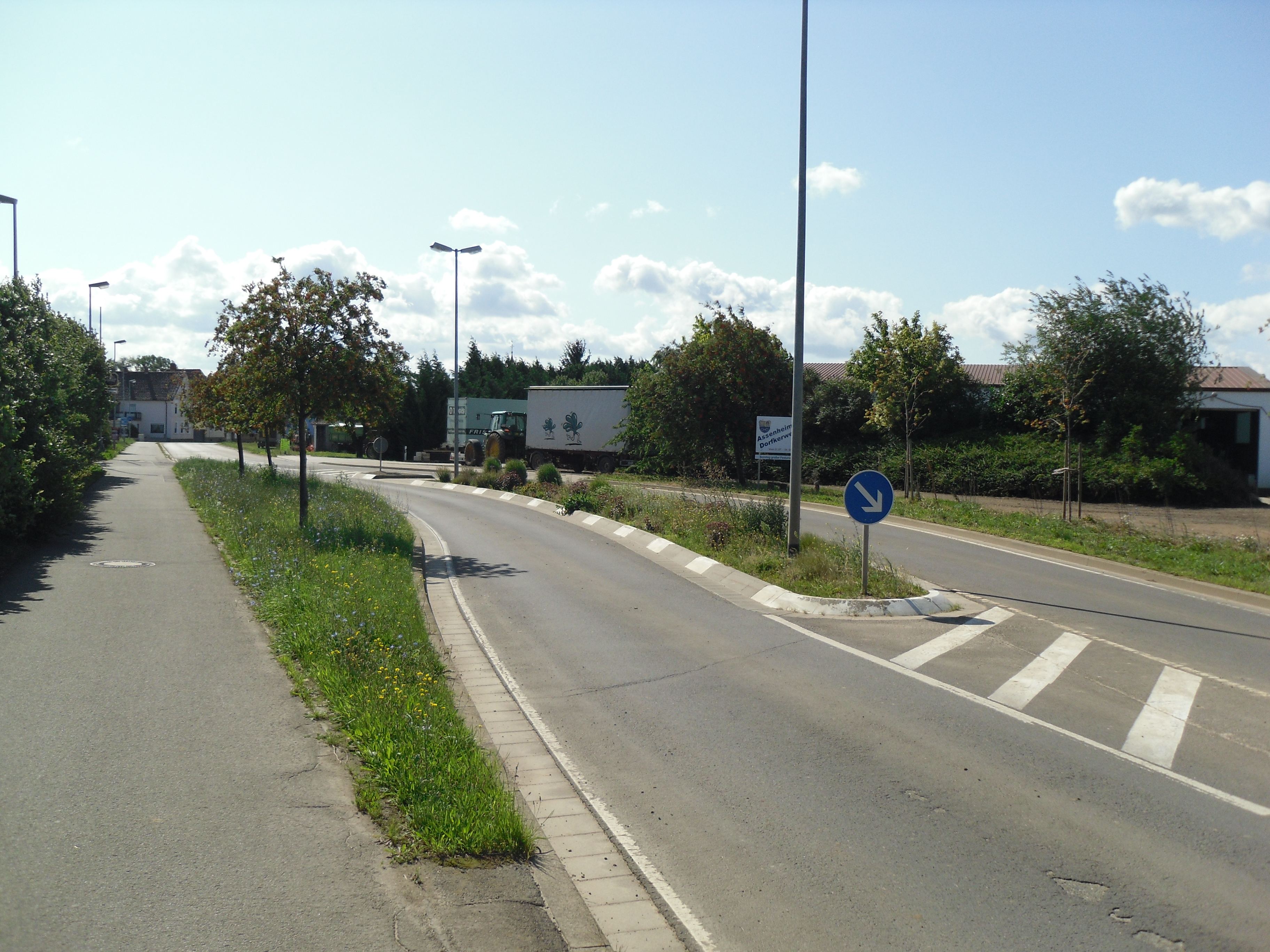Natürlich wollte ich wissen, wo es denn bereits Beispiele dafür gäbe. „In der Pfalz wurden solche sanften Verschwenkungen schon gebaut.“ Genauere Aussagen folgten leider nicht. Also habe ich mich selbst auf die Suche begeben, mit meinem „Freund“ GoogleEarth habe ich in „niedriger Flughöhe“ die Pfalz begutachtet. Leider sind die Satellitenbilder ja nicht immer die aktuellsten. Also kann man so neuere Umbauten nicht finden. Aber in Hochdorf-Assenheim wurde ich doch fündig. In der Ortseinfahrt der K19 von Gronau kommend liegt eine Verschwenkung, die immerhin ca. 90m lang ist.
