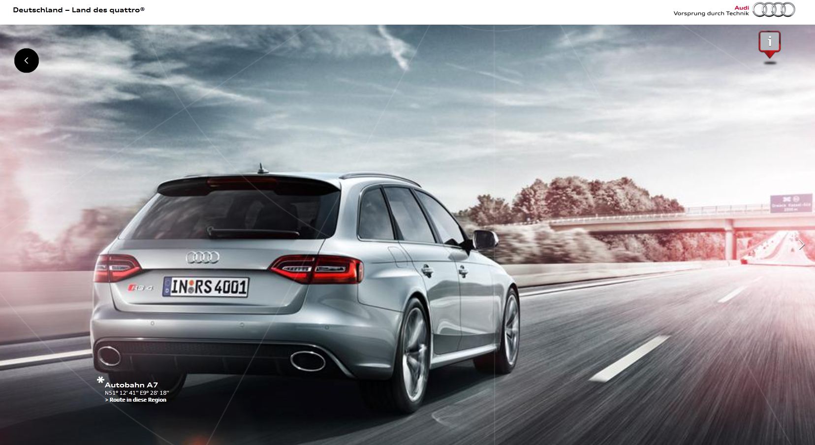 Klickt euch mal durch, ist echt ganz schick gemacht. Aber taugt die Geokodierung denn was? Ich picke mal ein paar Beispiele heraus. Weil ich mir nicht sicher bin, ob die Links von Audi Bestand haben, gebe ich nicht nur diese an. Zusätzlich habe ich die Bilder „gescreenshotet“ (aua). Auch hier stehen die Koordinaten unten links (und sind auch tatsächlich verlinkt zu GoogleMaps).
