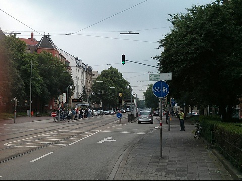 Wenn man in Karlsruhe stadtauswärts radelt auf der Relation Karl-Wilhelm-Straße, Karl-Wilhelm-Platz, Haid-und-Neu-Straße (was viele meiner Kollegen jeden Morgen tun), soll man am Karl-Wilhelm-Platz kurz auf den Gehweg wechseln – Ich weiß, daß das ein kombinierter Rad-Geh-Weg sein soll. Aber da stehen und laufen Fußgänger auf dem Weg zur Straßenbahn rum. Ich mag da nicht lang fahren 😦