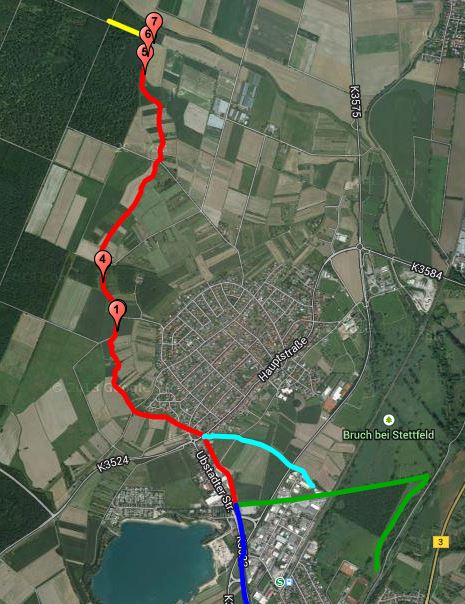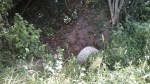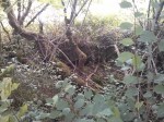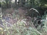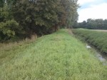Wirklich ablaufen kann Wasser durch den Graben eh nicht. Über seinen kompletten Verlauf ist der Graben stark zugewuchert (Bild 3). Zum großen Teil wachsen gar Bäume im gesamten Grabenquerschnitt (im Bild 4 ist es noch harmlos). Im nördlichen Bereich ist der Graben mehrmals verfüllt (Bild 5), wahrscheinlich um den Zugang zu Hochsitzen zu erleichtern. Auch die alten Durchlässe verdienen ihren Namen nicht mehr (Bild 6). Es wahr wohl mal so geplant, das der Graben in den Hardtwald entwässert. In den Kriegsbach geht es ja wegen des Deiches nicht (Bild 7).