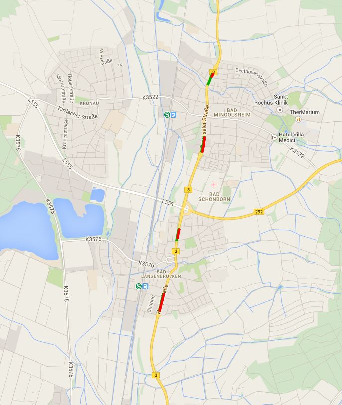 Die Gemeinde Bad Schönborn versucht sich an einem Radverkehrskonzept. Als Sofortmaßnahme (man könnte auch sagen: „Holterdiepoltermaßnahme“) wurden in beiden Ortsteilen Fahrradschutzstreifen entlang der B3 aufgemalt. Nun bin ich ja ein großer Verfechter von Fahrradschutzstreifen, aber so nicht. Auch die Grünenfraktion im Gemeinderat war wohl etwas irritiert: „Warum diese Schutzstreifen für Radfahrer quasi über Nacht angebracht worden seien…“ stand in der BNN zu lesen (leider hab mir nicht das Datum notiert, aber egal). Bürgermeister Huge hat darauf wohl geantwortet: „… der Schutzstreifen sein eine Maßnahme aus dem Sofortpaket…“ und „Die Markierung sei dort angebracht worden, wo die Straßenbreite es zuließe“. Wo das ist, könnt Ihr in der Karte sehen.