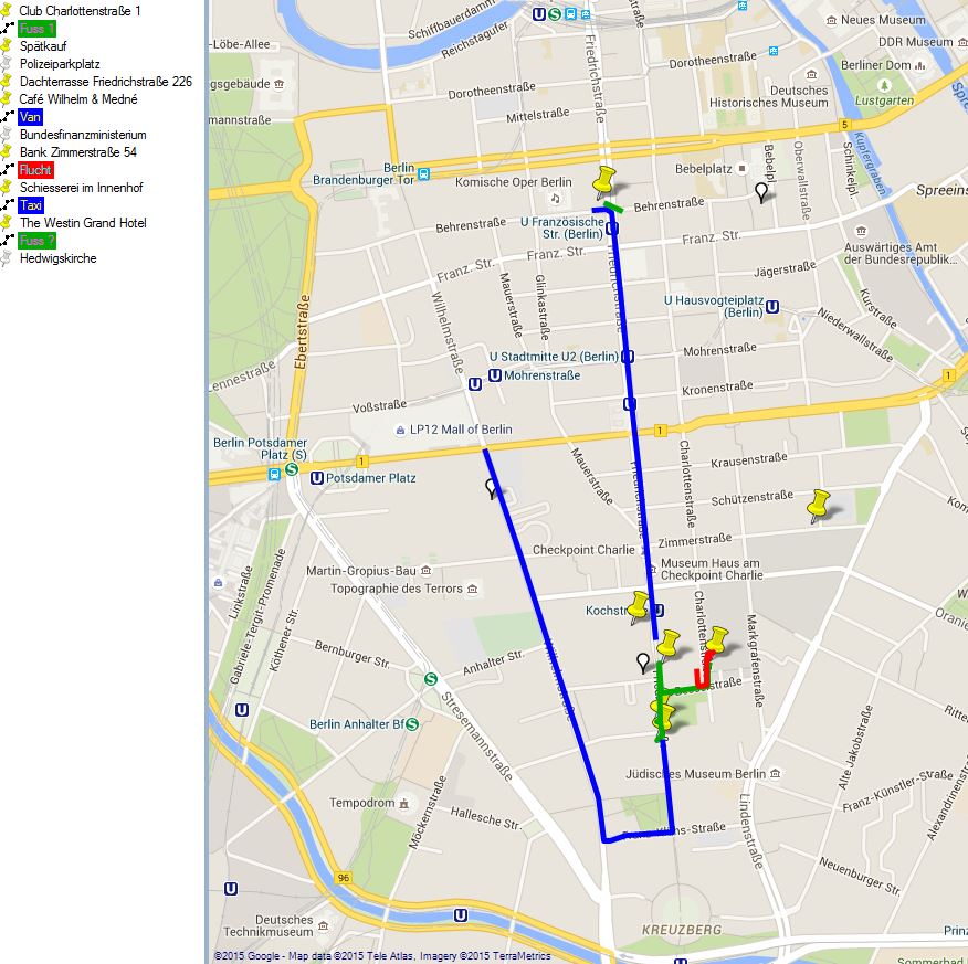 Manches ging mir einfach zu schnell und es war bestimmt Absicht, dass in allen Autos die Scheiben beschlagen waren. Deshalb sind die Laufwege und Autofahrten nicht vollständig. Die Tiefgarage, in der der Gangsterboss Andi wartet, konnte ich auch nicht zuordnen.
