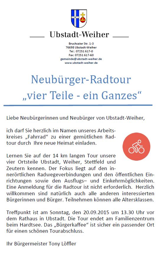 In https://stefanhock.wordpress.com/2014/10/21/neuburgerinnen-radtour/ hatte ich es angekündigt, jetzt ist es bald soweit. Zusammen mit dem Arbeitskreis Fahrrad und der Gemeindeverwaltung Ubstadt-Weiher biete ich eine Neubürger-Radtour an.