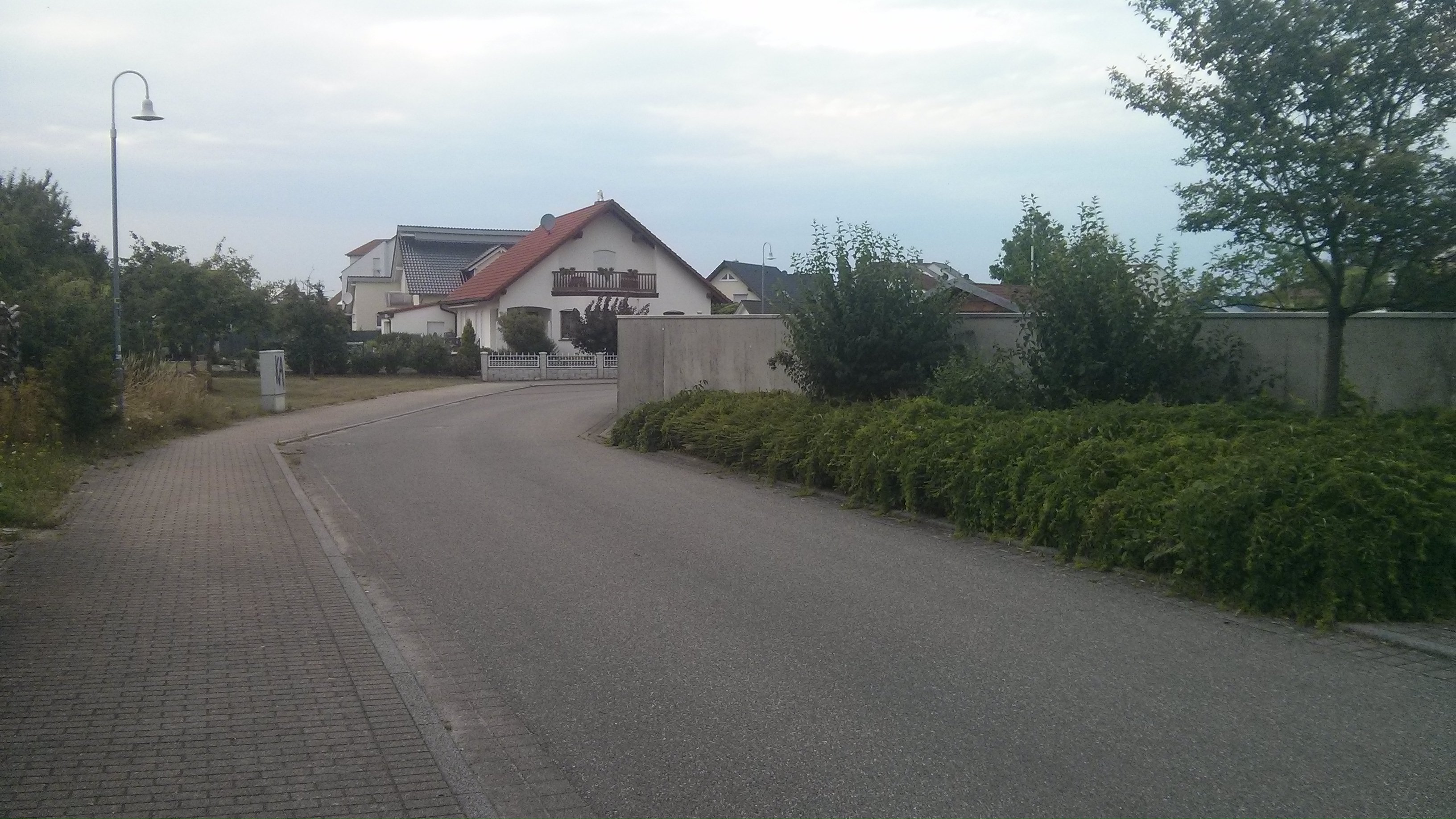 Aber ich schweife ab. Als das Neubaugebiet Furtwiese angelegt wurde, bestand ein Grundstückseigentümer in der bestehenden Bebauung darauf, eine Mauer als Sicht- und Lärmschutz um sein Grundstück ziehen zu dürfen. Das Ergebnis seht Ihr auf den Bildern. Hübsch geht anders. Mir ist natürlich klar, dass die Mauer nicht weg kommt. Aber die Ecke bzw. die S-Kurve ist nicht ganz ungefährlich, weil die Sichtbeziehung unterbrochen ist. Wir haben dort auch schon mehrere brenzlige Situationen erlebt. Meinen Kindern hab ich beigebracht, möglichst weit mittig zu fahren, um früher zu sehen und gesehen zu werden. Sich möglichst an den Rand zu quetschen hat sich nicht bewährt.