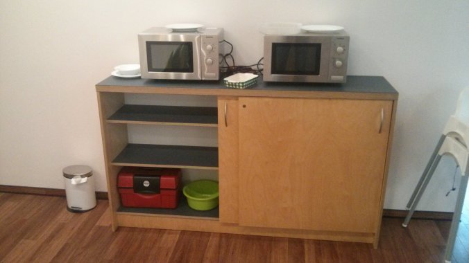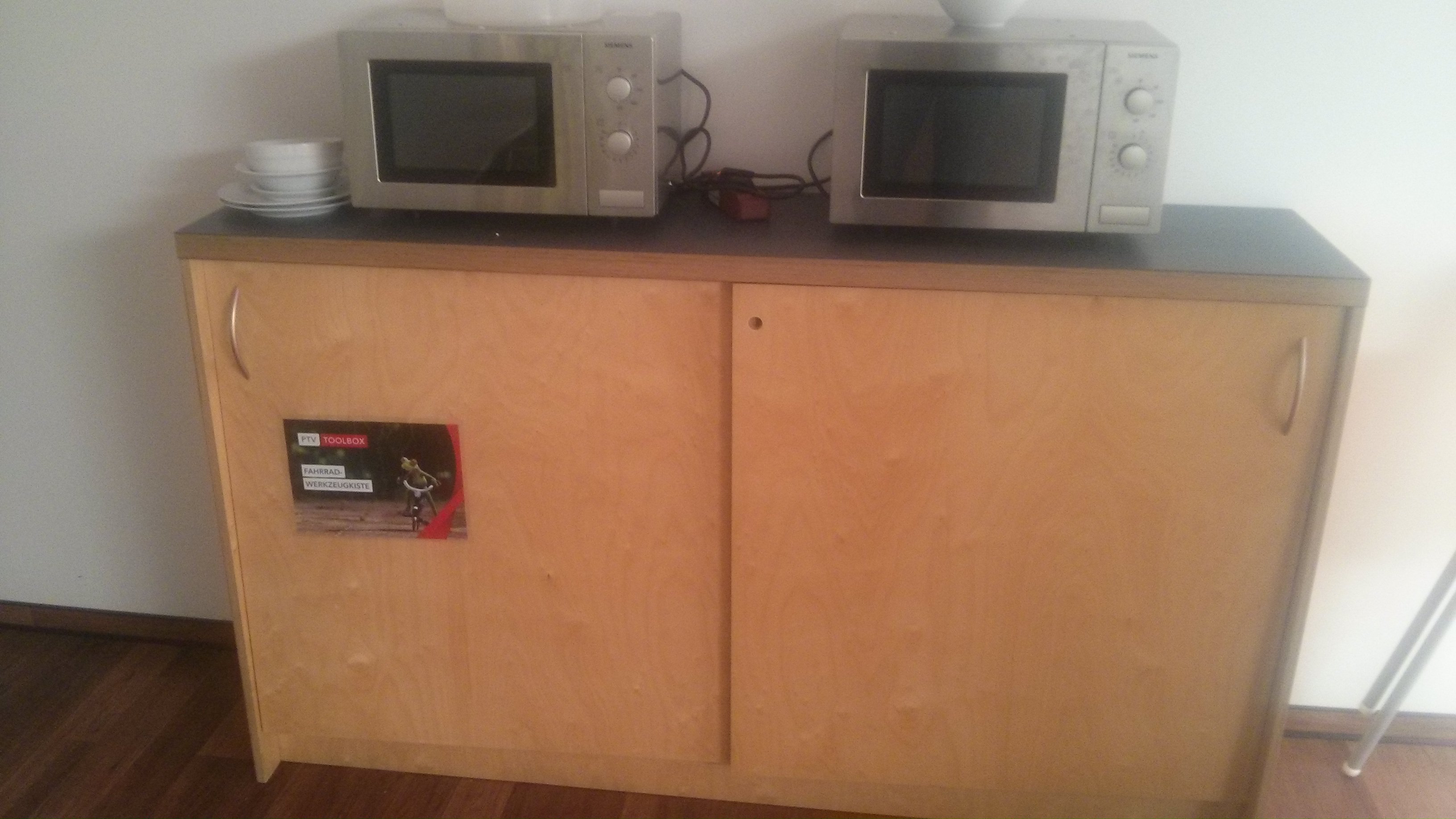 Also doch nur eine Kiste und für die haben wir jetzt einen Platz in einem Schrank in der Kantine gefunden. Da kann jeder jederzeit dran. Muss die Kiste halt runter tragen.