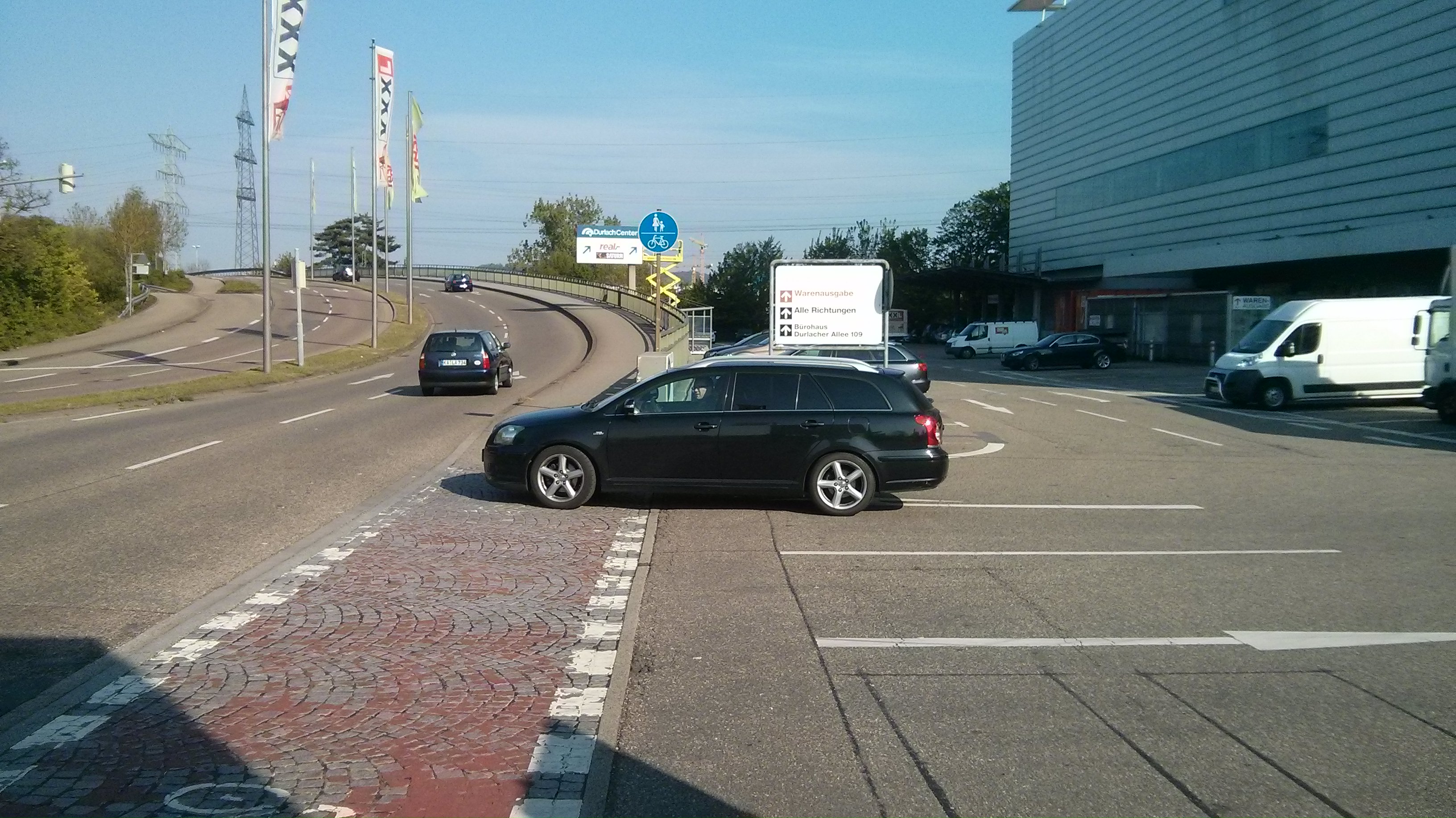 Autofahrer wollen vom Mann-Mobilia-Parkplatz in Karlsruhe herunter und tasten sich dazu so weit wie möglich in den fließenden Verkehr hinein. Dazu gehört aber halt auch ein Radweg. Jetzt könnte man anmerken, dass der schon recht verblasst ist, das ist allerdings ein recht billige Ausrede. ich würde mich darüber nicht ganz so aufregen, wenn der Radweg die Brücke hinauf nicht mit einer ganz fiesen Rampe starten würde. Die fährt man besser mit Schwung hoch, sonst wirkt man echt unsouverän.