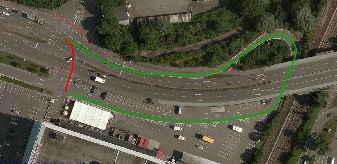 Dabei könnte es doch so bequem sein. Wenn man die (auch laut Schild empfohlene) Schleife unter der Brücke durch fährt (grün), kommt man gefahrlos in Richtung Innenstadt. Das bemerkt nur keiner!