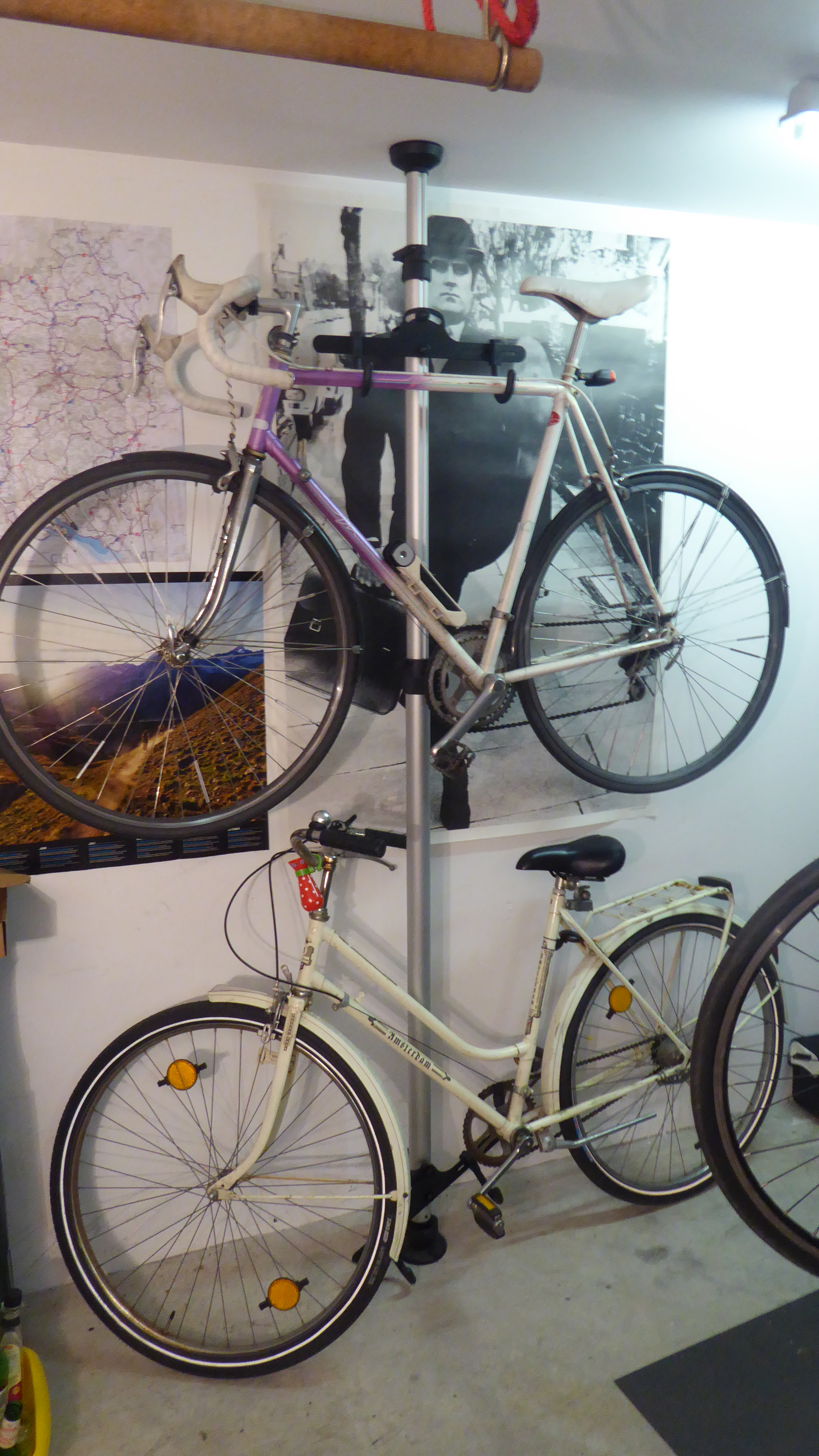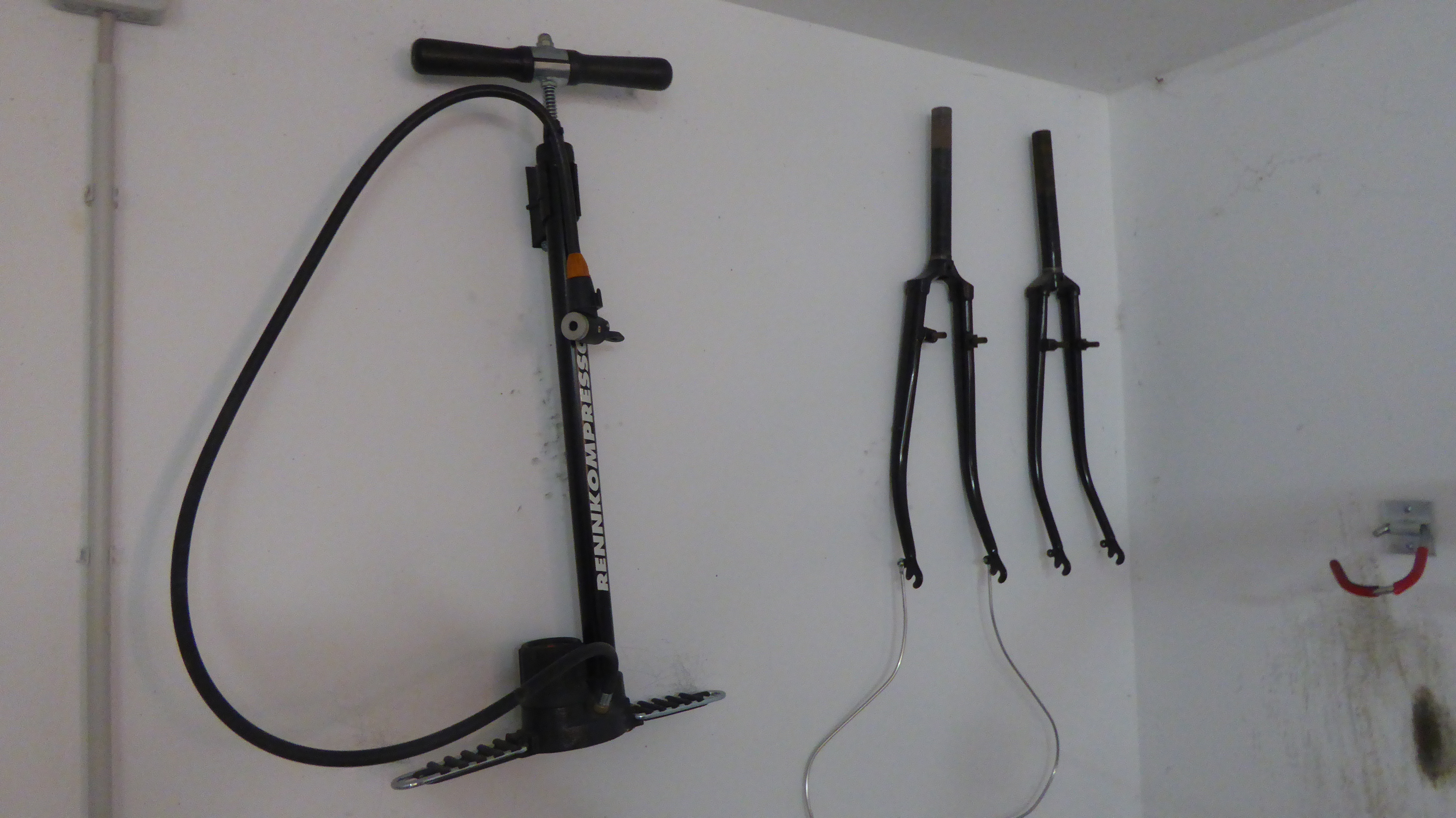 Verschieden weit aufgebogen dienen sie jetzt als Zentrierständer (er hat Ständer gesagt, hihi) für Laufräder. In der Werkbank ist extra ein Loch wo ich das Steuerrohr reinstecken kann (der Satz hat es aber auch in sich).