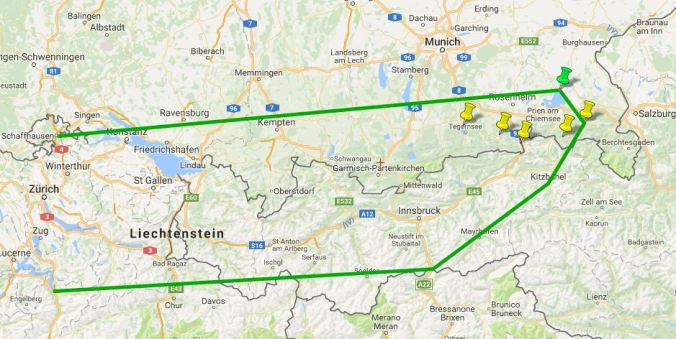 Einfacher wär’s natürlich, ich würde nach meinem Geburtstag von Seebruck losfahren. Auch dafür habe ich einen Korridor in die Karte eingezeichnet, der mich grob Richtung Schweiz führen würde.