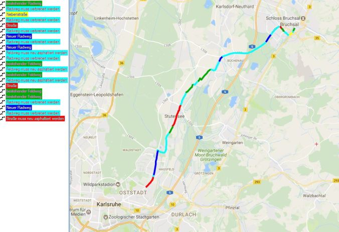 Mein Favorit ist der „Radschnellweg Karlsruhe-Stutensee-Bruchsal“, der allerdings nur in der mittlerer Kategorie „potenzielle Radschnellverbindung“ eingeordnet ist. Die Variante über Weingarten ist höher priorisiert, aber ungefähr 3 km länger. So bin ich früher nach Karlsruhe gefahren, hab die Variante inzwischen wegrationalisiert.