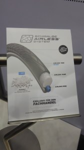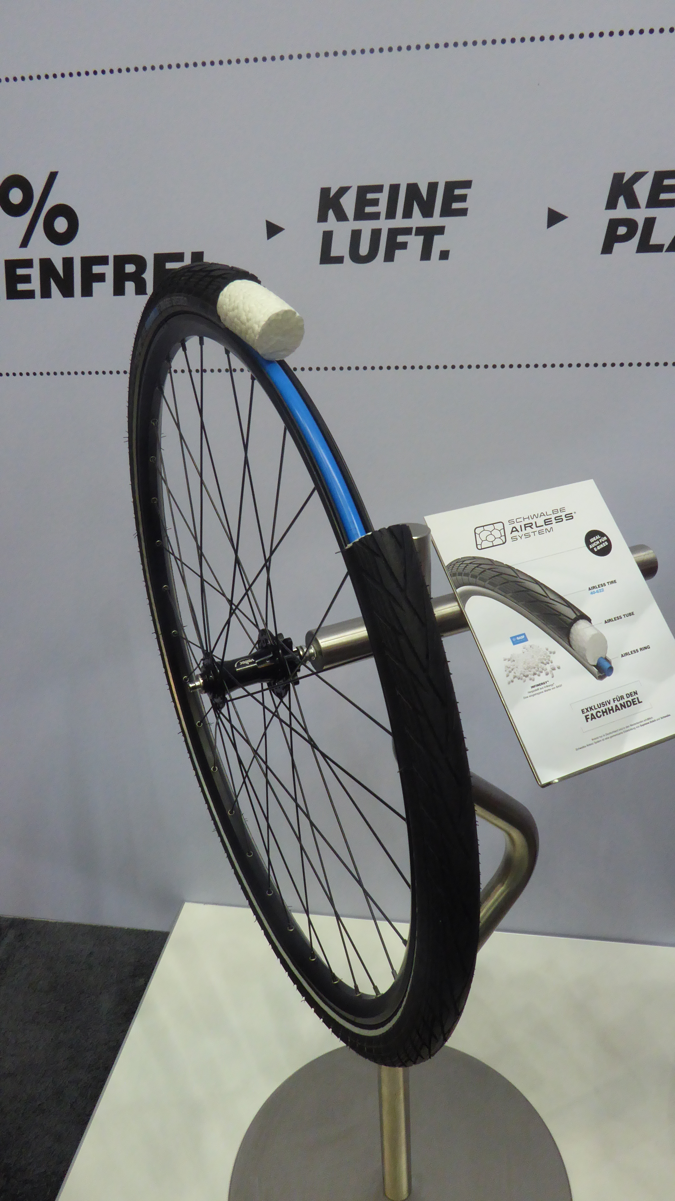Obwohl, vielleicht ja doch! Schwalbe zeigte einen Reifen ohne Luft. Stattdessen besteht das Innenleben aus diesem Zeug, das aussieht wie Styropor, aus dem neuerdings die Sohlen von Sportschuhen gefertigt werden. So ganz überzeugt ist man aber auch bei Schwalbe wohl nicht, denn so richtig an die große Glocke gehängt hat man es gefühlt eher nicht.