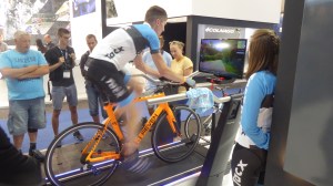 Wenn sich an einem Messestand was bewegt, dann schauen die Leute. Bei Taxc durfte sich so eine arme Sau auf einem Laufband für Rennräder abquälen. Ich werd nur den Verdacht nicht los, dass die meisten nur drauf gewartet haben, ob es ihn da runter haut.