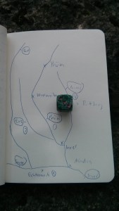 Meine wichtigsten Utensilien sind dabei ein Notizbuch und ein Würfel. Wenn ich mal nicht weiter weiß, zeichne oder schreibe ich die Alternativen auf und vergebe Nummern.