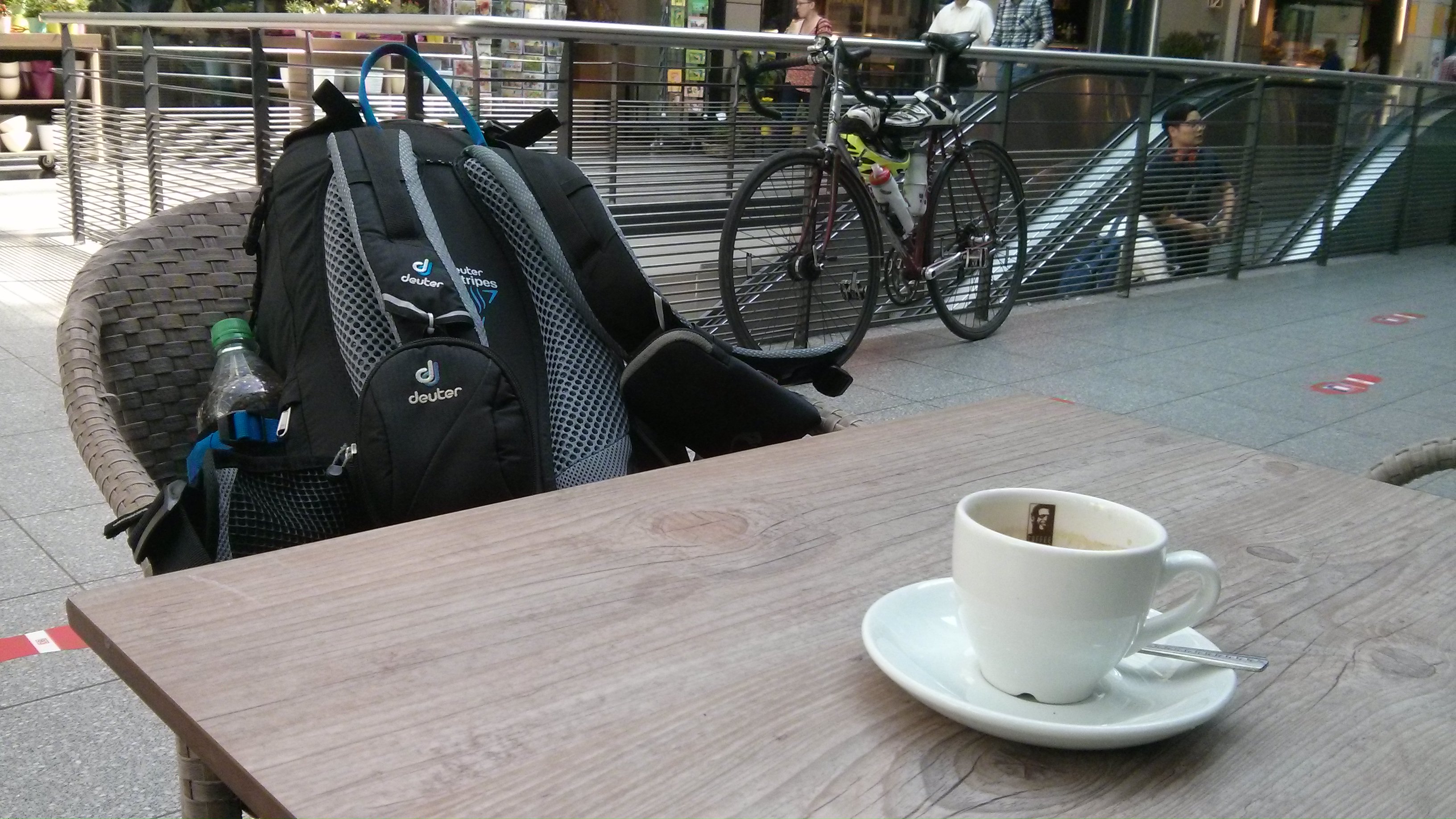Die erste Kaffeepause musste bereits in Mannheim Hbf sein. Immerhin seht Ihr auf dem Foto meine komplette Ausrüstung.