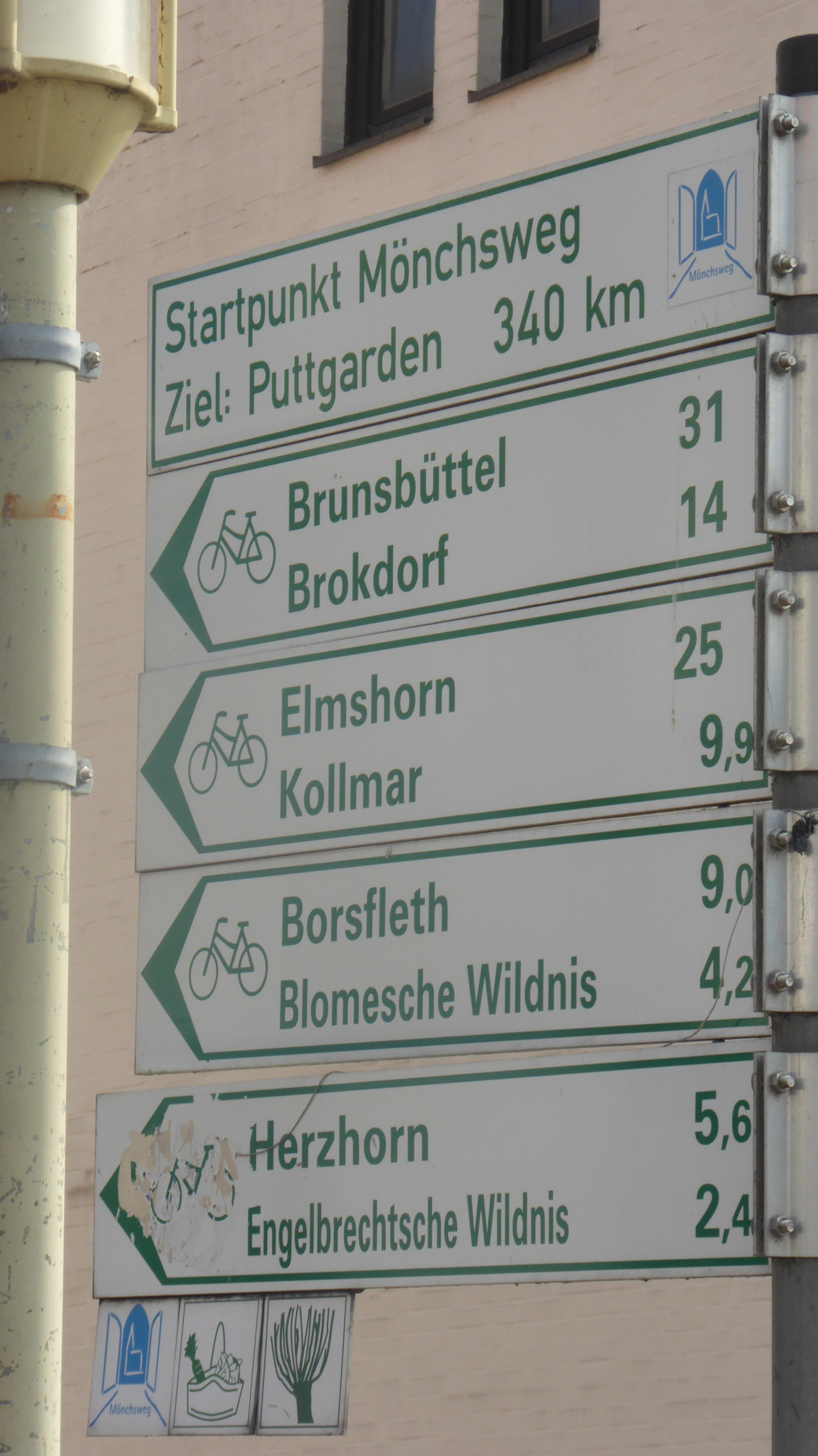Der Mönchsweg mäandert 340 km bis Puttgarden. Das ist nix für schnelles vorankommen, aber der Beschilderung bin ich häufiger begegnet. Über meinen Übernachtungsort Itzehoe gibt’s nichts schönes zu sagen.