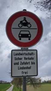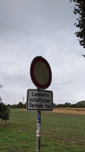 Doch im Laufe der Jahre sind noch andere Zeichen dazu gekommen. Da ist jetzt auch ein Fernwanderweg und ein Jakobsweg ausgewiesen. Da wandern und pilgern also inzwischen auch Menschen. Und die scheinen nicht alle so entspannt zu sein, wie ich es von Pilgern erwarten würde. Mir wurde zugetragen, dass es dort auch mal zu Meinungsverschiedenheiten zwischen Wanderern und Radlern kommt. Erstere berufen sich nämlich auf die Beschilderung. Bis auf Traktoren dürfte dort niemand fahren.