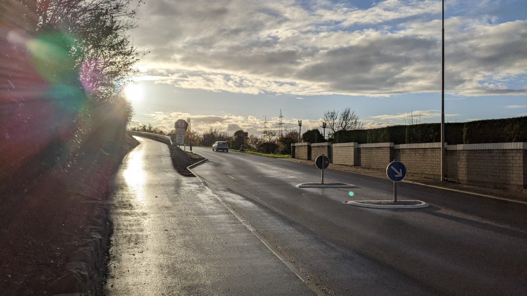 Der Verlauf der Randsteine erscheint mir arg eckig. Ich bin die Stelle auch schon mit dem Auto gefahren und fand es etwas unharmonisch. Aber vielleicht ist das gewollt und gar nicht so schlecht, um die Autofahrer:innen optisch noch mehr einzubremsen. Die Einfädelung liegt auch so weit links, man mit einem breiteren Auto (also fast allen) unwillkürlich Gas weg nimmt, wegen dem Gegenverkehr. Was ja auch gut ist…