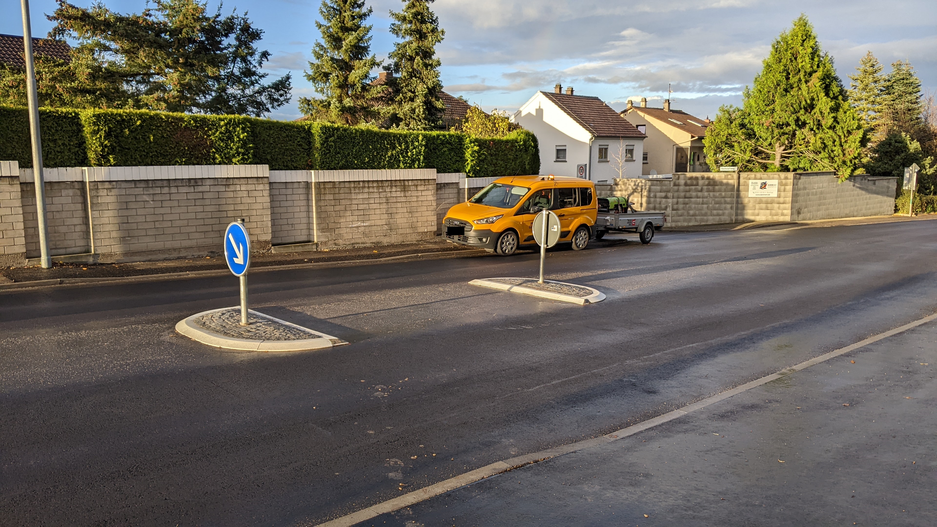 Der Verlauf der Randsteine erscheint mir arg eckig. Ich bin die Stelle auch schon mit dem Auto gefahren und fand es etwas unharmonisch. Aber vielleicht ist das gewollt und gar nicht so schlecht, um die Autofahrer:innen optisch noch mehr einzubremsen. Die Einfädelung liegt auch so weit links, man mit einem breiteren Auto (also fast allen) unwillkürlich Gas weg nimmt, wegen dem Gegenverkehr. Was ja auch gut ist…